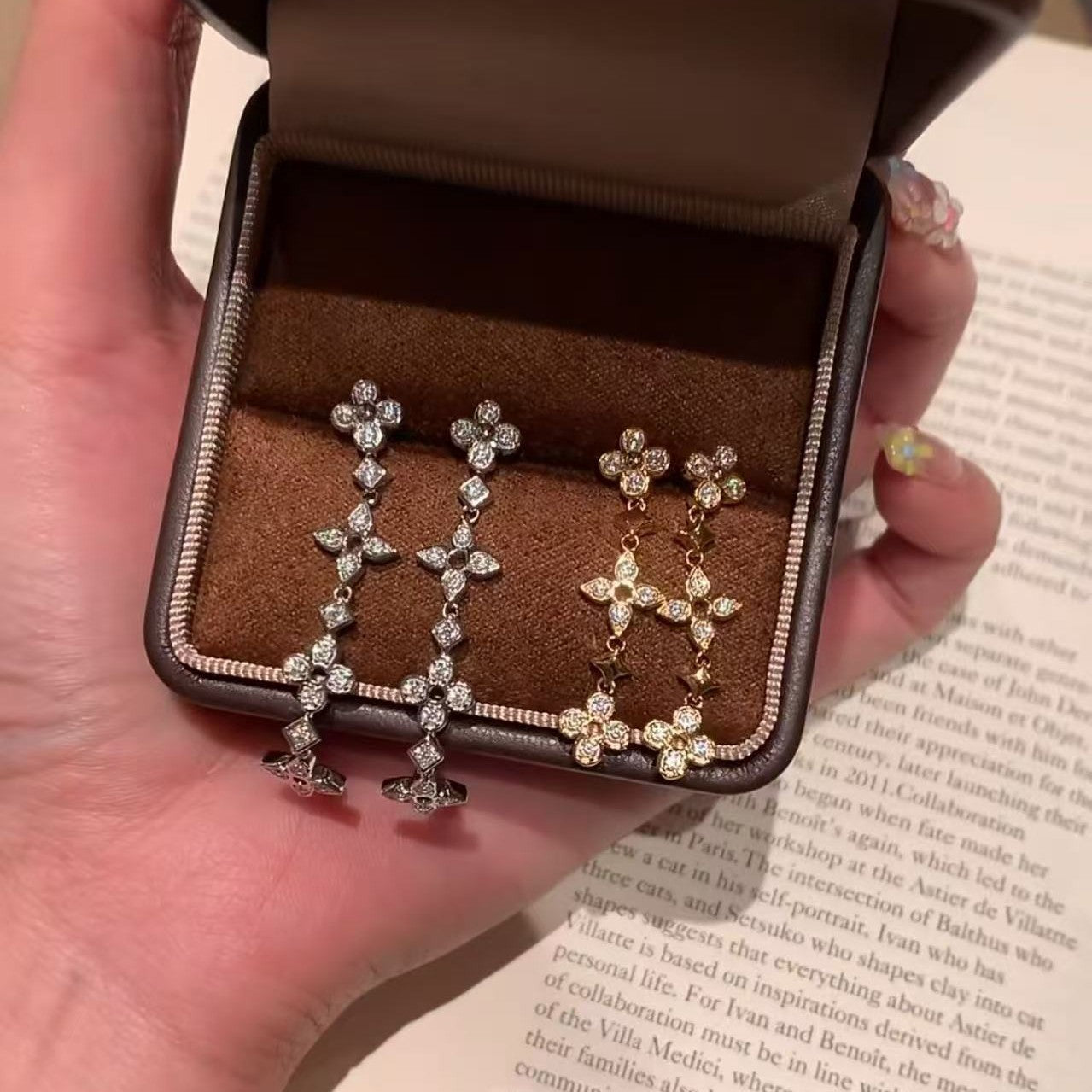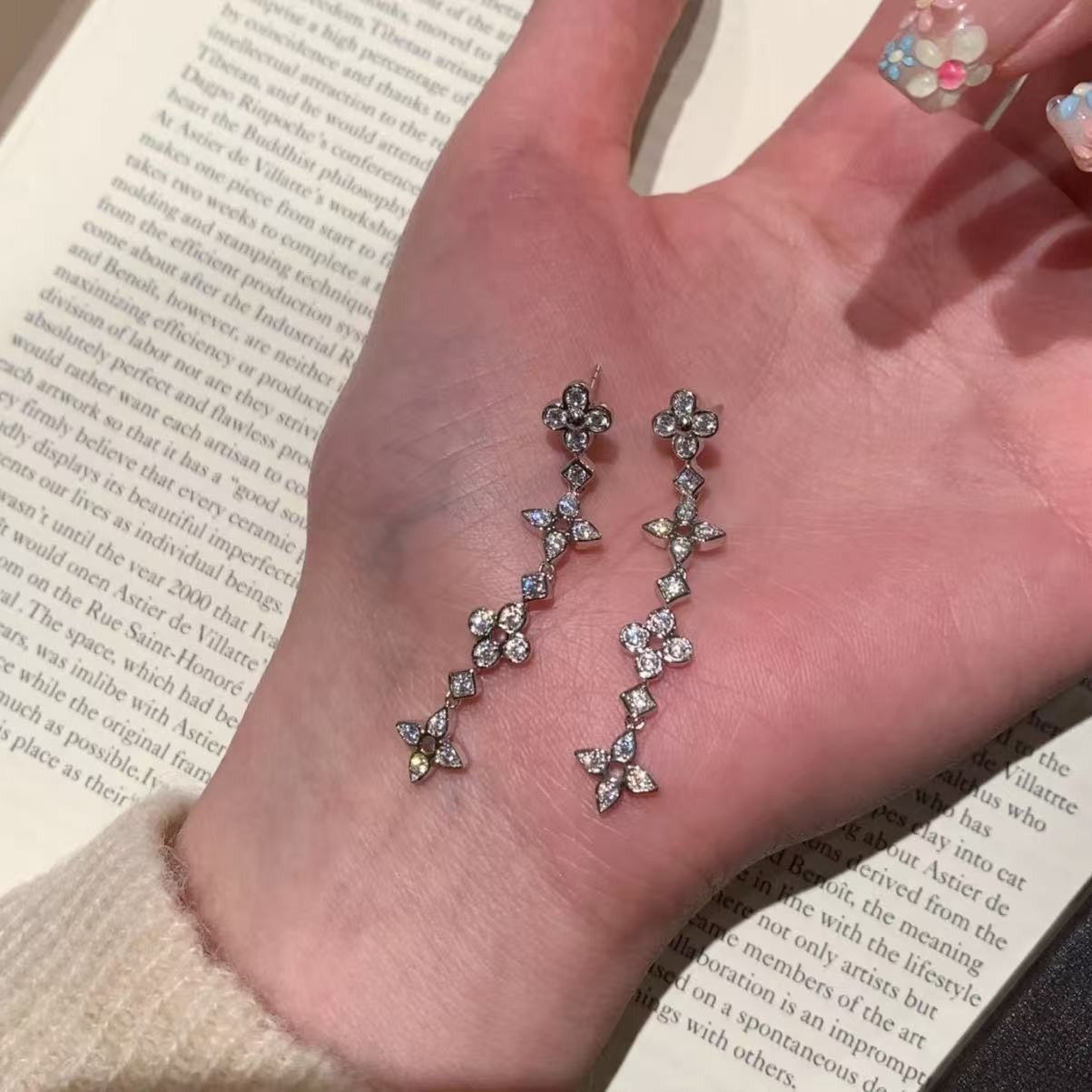 S925 Sterling Silver Light Luxury High Carbon Diamond Four-Leaf Clover Tassel Earrings High-End Sparkling Diamond Sweet Trendy Fashion