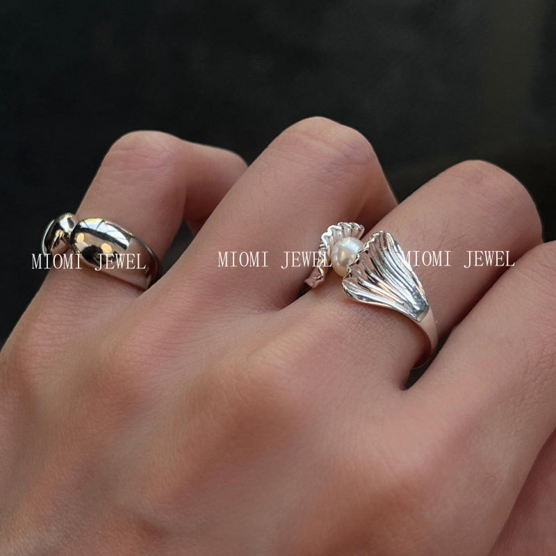S925 Sterling Silver Beach Shell Tree Shadow Freshwater Pearl Ring for Women, Niche Design, Adjustable Open Smart Tail Ring