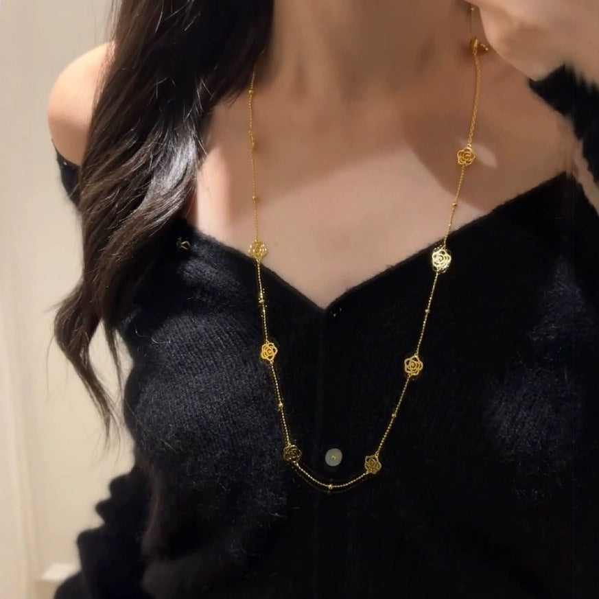 Sterling Silver S925 Real Gold Plated Double Layer Rose Flower Beads Sweater Chain Long Necklace