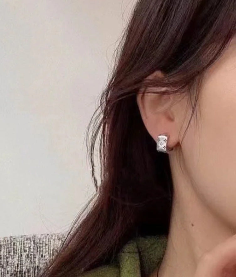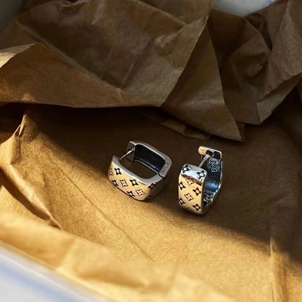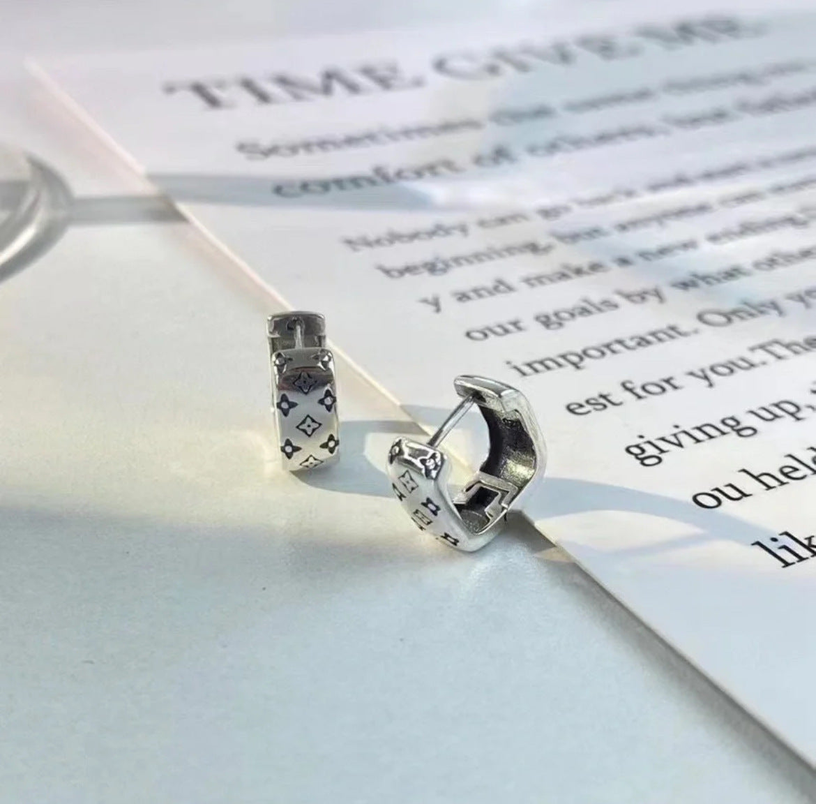 Sterling Silver S925Black and White Four-Leaf Clover Vintage Pattern Wide Earrings High-End Retro Style Earrings