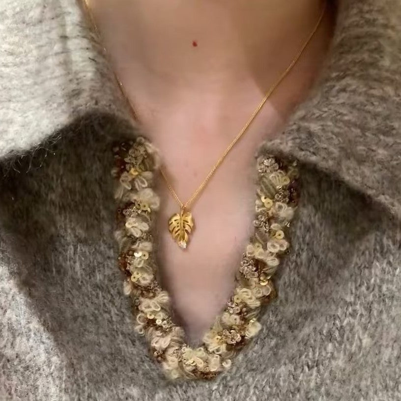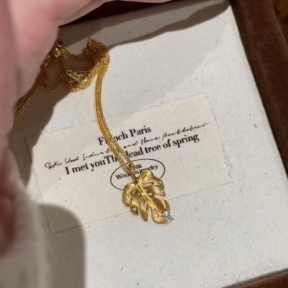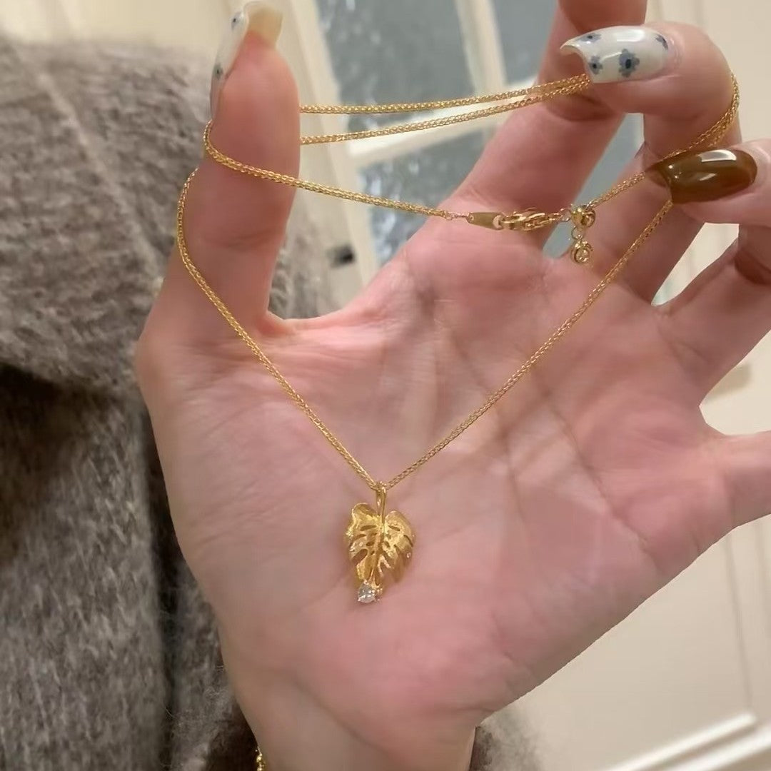 Pure Silver S925 Vintage Brushed Craft Monstera Leaf Pendant Necklace Exquisite High-end Niche Design Collarbone