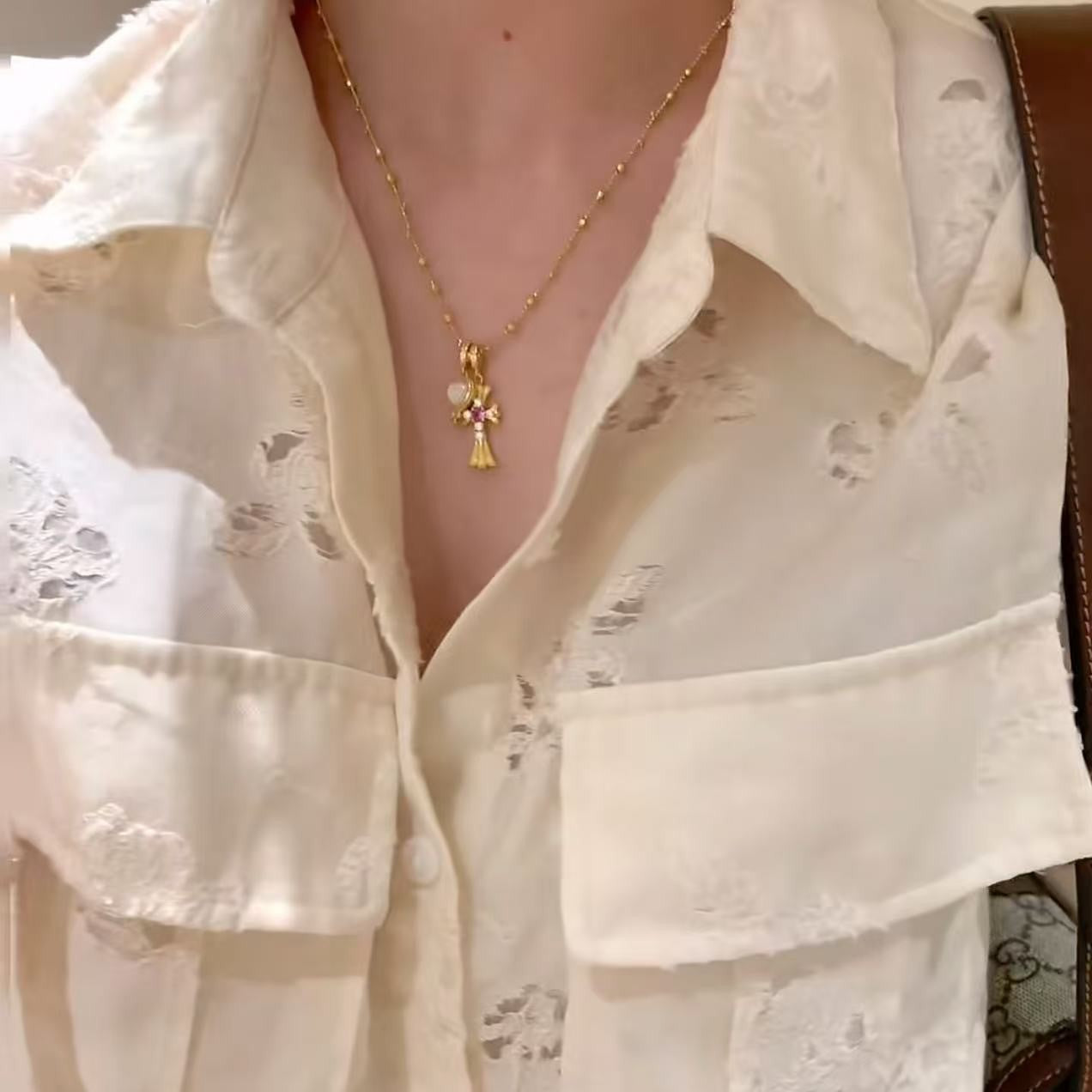 Brushed Craft American Retro Cross Heart White Shell Fairy Chain Necklace Niche Design Light Luxury High-end Feel