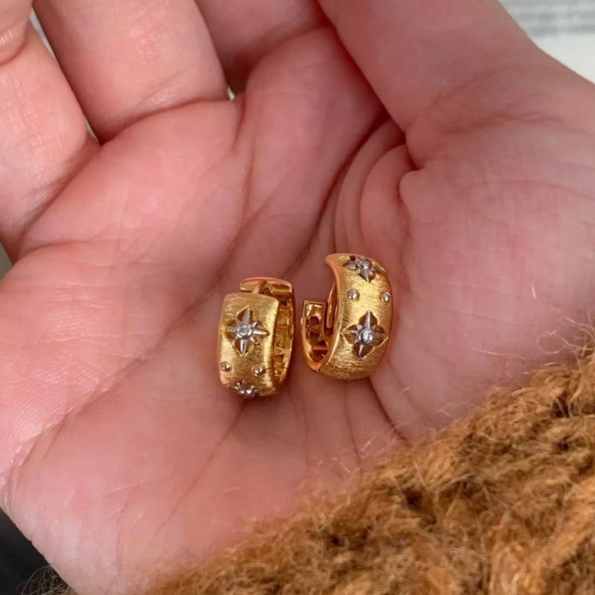 Pure Silver S925 Vintage Gold Eight-Pointed Star Brushed Earrings Retro Design Hollow Four-Leaf Flower Ear Clips