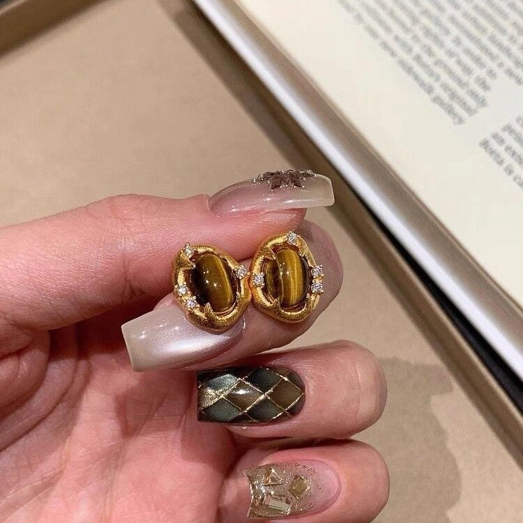 Vintage Style Brushed Craft Tiger Eye Stone Earrings Exquisite Versatile Fashionable Elegant Earrings Light Luxury High-end Feel