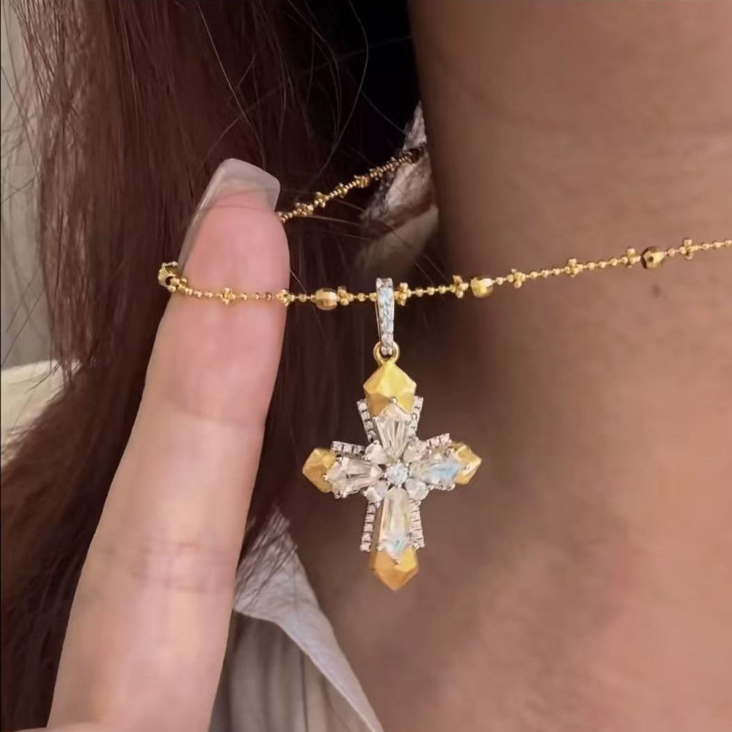 Sterling Silver S925 Brushed Craft Cross Fairy Chain Necklace Vintage Mid-Ancient Light Luxury High-End Niche Design