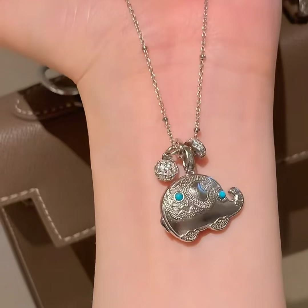 Pure Silver S925 Ethnic National Style Ancient Method Gold Elephant Turquoise Necklace Lucky Fortune Harvest Necklace Light Luxury Fashion